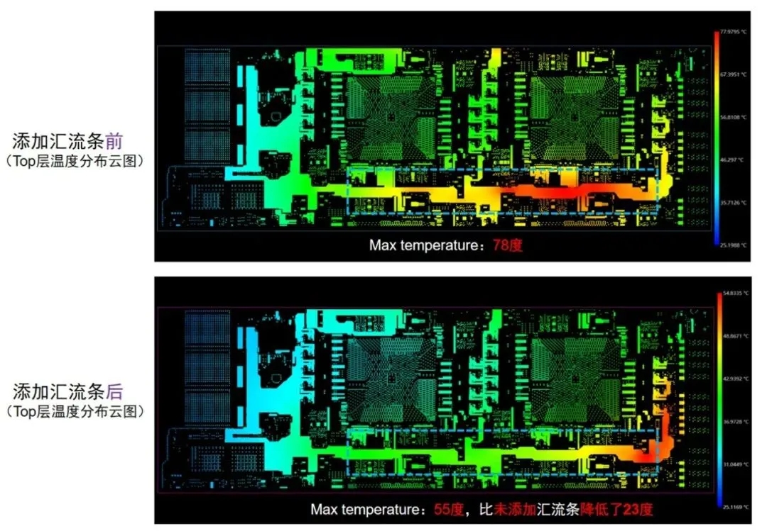 PhySim ET添加銅塊(匯流排)前后溫度分布結(jié)果對比