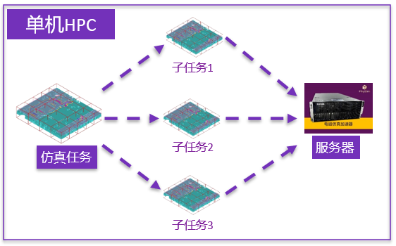 PhySim Mulan系列仿真軟件中的ACEM,擁有有限元算法FEM、FDTD時域算法等混合求解算法,以及新型高效的網格剖分iMESH技術,開發了兩種HPC模式用于加速計算,以應對大規模電磁問題的加速方案。 單機HPC:即將完整任務拆分成多個子任務,派分至同一臺機器中并行計算,適用于核數較多的服務器; 多機HPC:與單機HPC類似,但卻是將子任務派分至不同的機器中進行并行計算,適用于需要使用更多資源來加速大尺寸模型求解的場景。