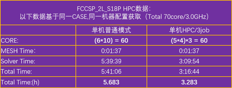 本圖表展示了在相同案例(CASE)、配置和資源條件下,普通模式與單機HPC模式的效率對比: 在同樣是60core的資源下,普通模式耗時5.68小時, 而單機HPC拆分成了3個子任務,總資源同樣為60core,耗時僅為3.28小時 即:單機PHC模式相比普通模式,在同資源情況下效率可提升約73%